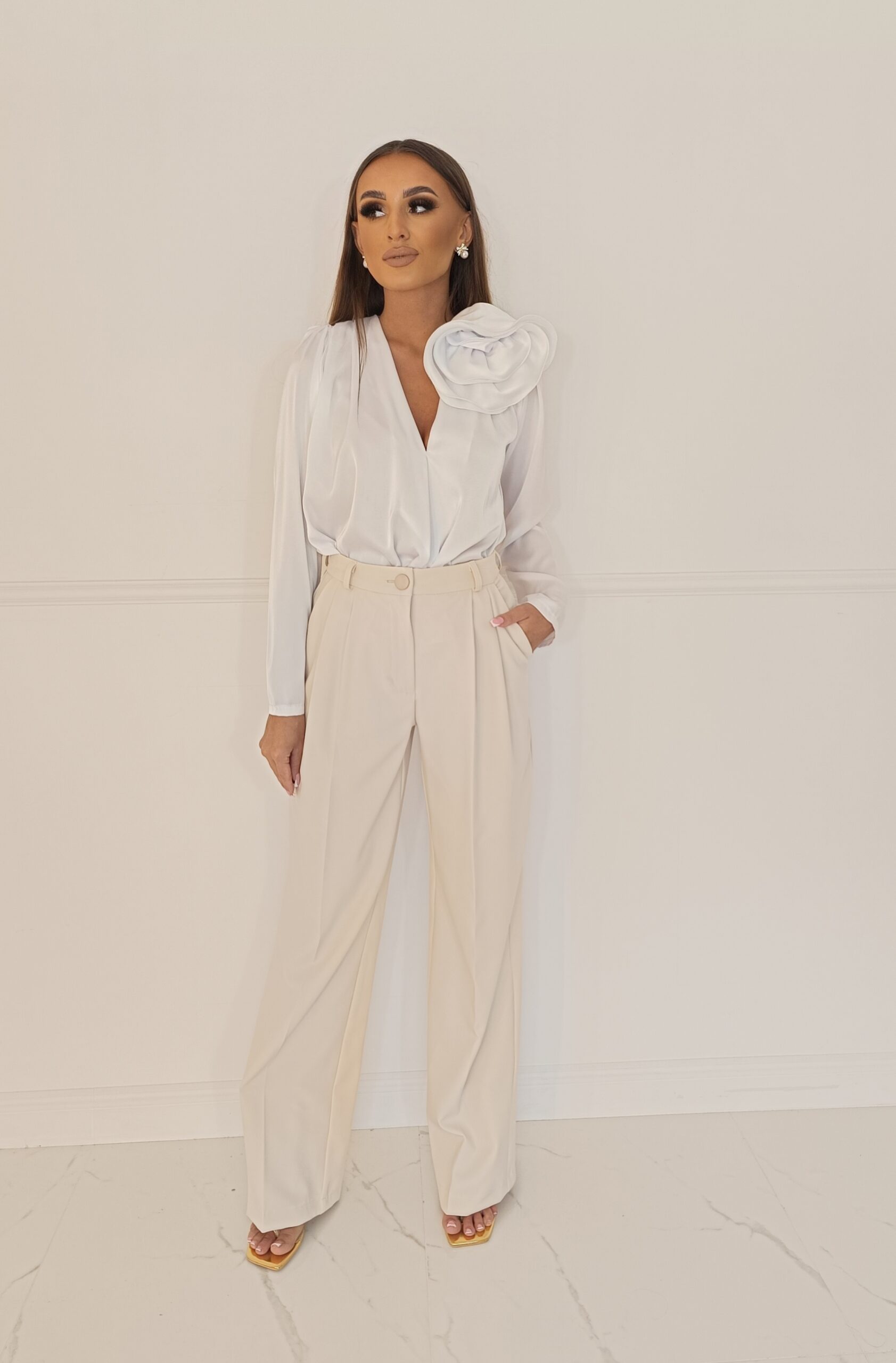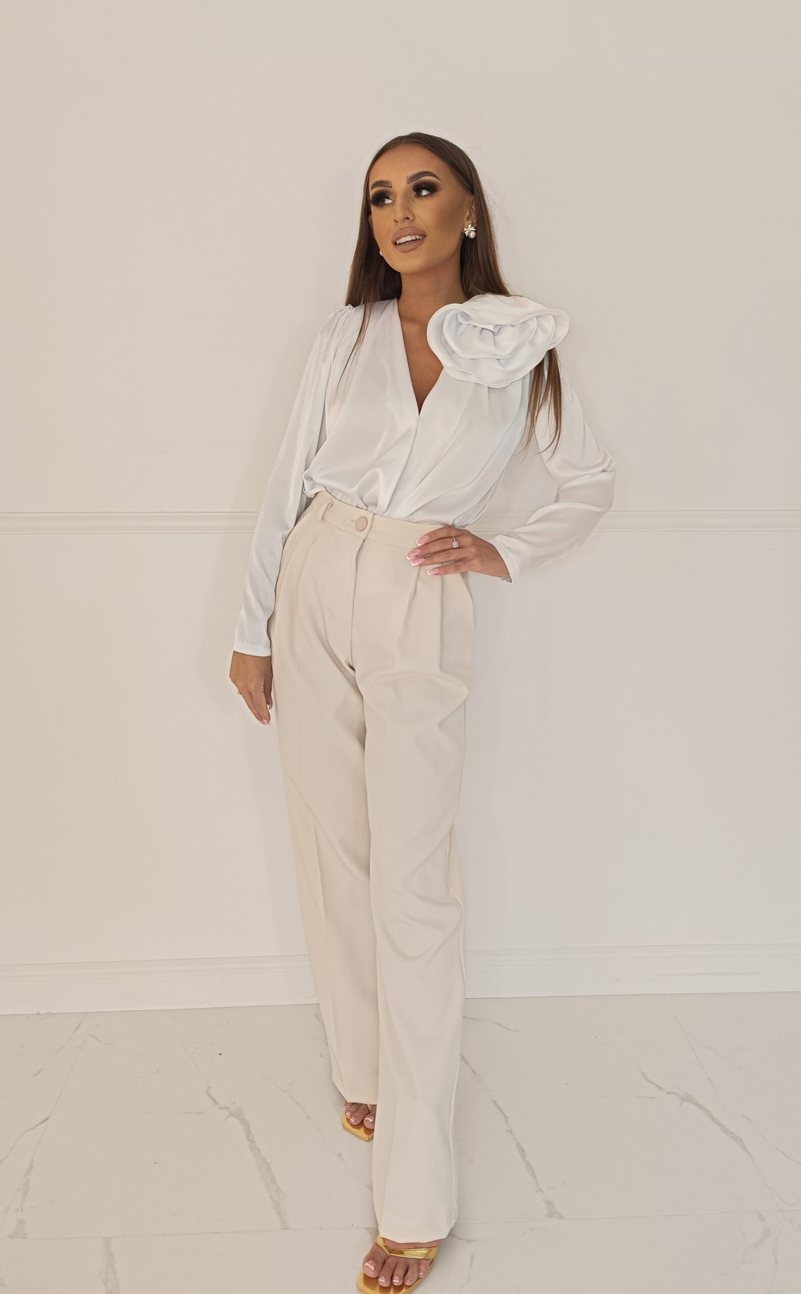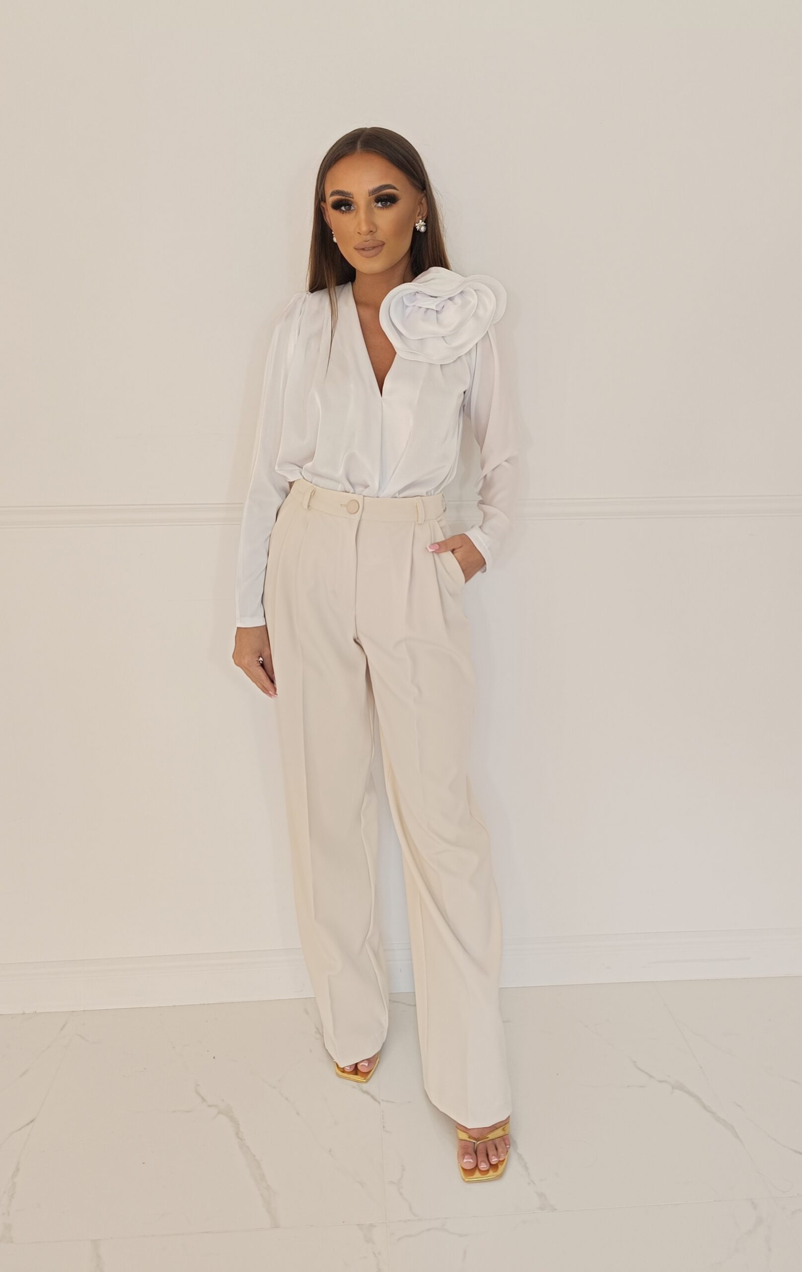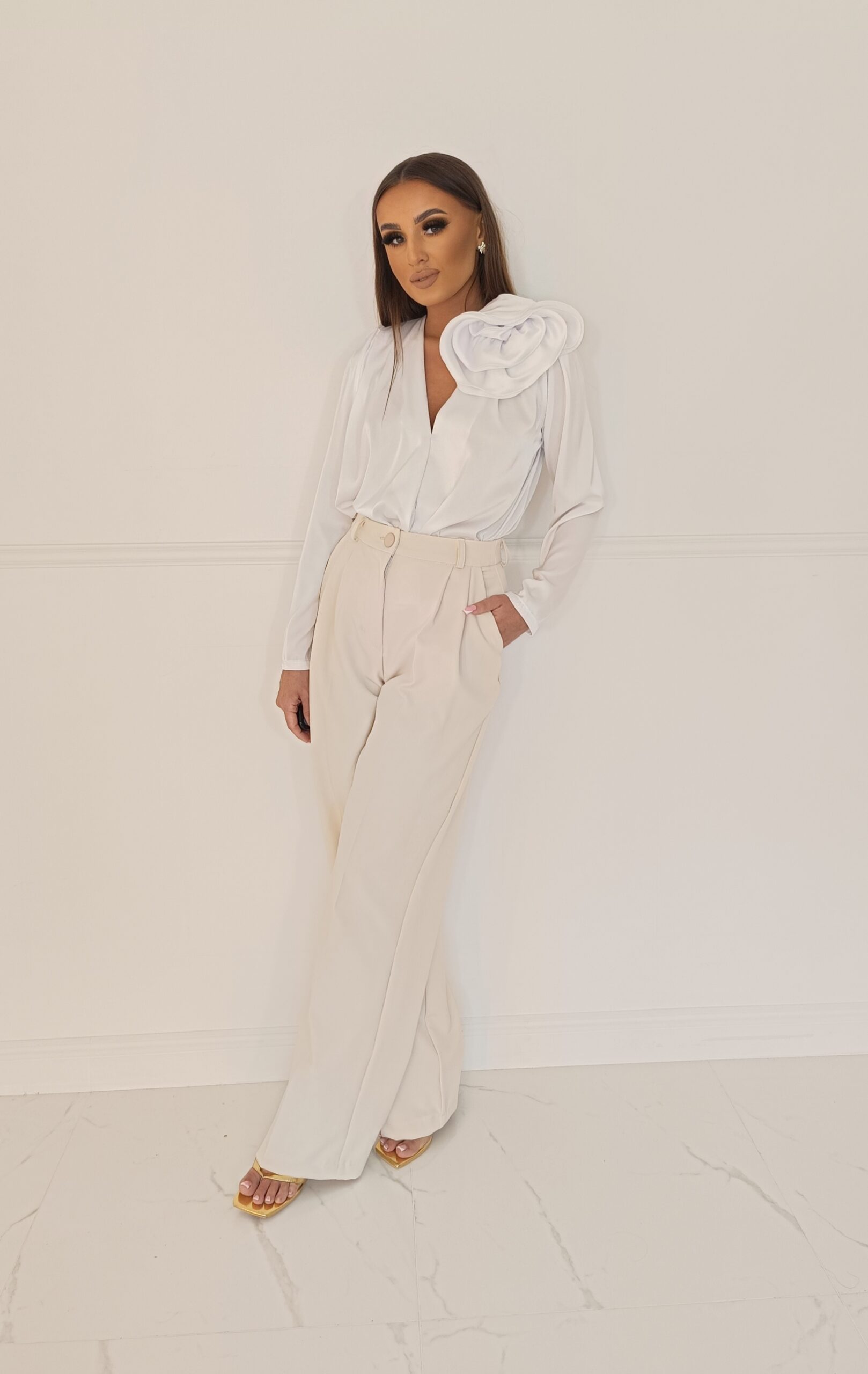 Elegancka bluzka z kopertowym założeniem, zebrana szwem w dekolcie oraz na dole (na stałe), róża jest odpinana na agrafce.