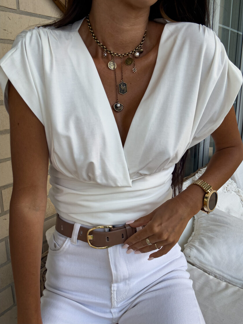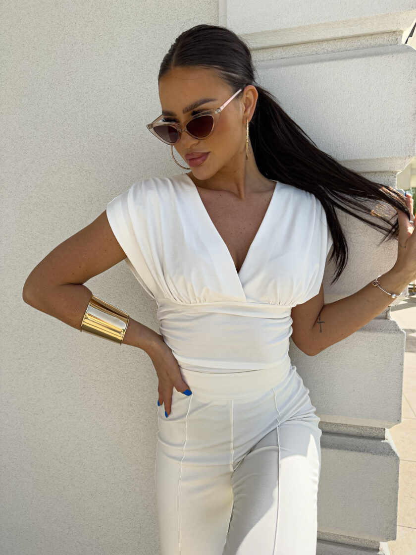 Bluzka o krótkim kroju, dekolt V. Delikatny rękawek z marszczeniami na ramionach. Pięknie podkreśla biust, materiał idealnie pasujący do spodni SUMMER LIGHT. Dzięki temu można stworzyć cudowny zestaw.