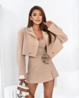 Równowaga między klasyką a nowoczesnym designem sprawia, że ten komplet to idealna propozycja dla kobiet ceniących sobie subtelność detali i elegancki look. Garniturowy komplet to marynarka i spódnico-spodenki, które tworzą harmonijną całość. Marynarka o krótkim kroju emanuje szykownym stylem – posiada podszewkę, elegancki rewers, poduszki w ramionach i zapinana jest na dwa guziki. Spódnico-spodenki uzupełniające zestaw posiadają wygodny krój, który zapewnia komfort noszenia. Zapinane są bocznym zamkiem a detalem, który wprowadza subtelny akcent dla designu jest odpinany kwiat, który możesz dostosować do swoich stylizacyjnych potrzeb.