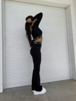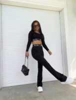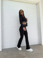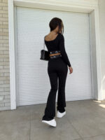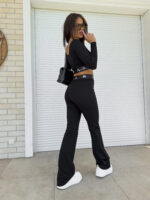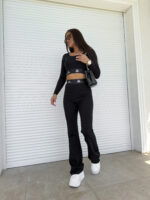 Komplet składający się z topu na długi rękaw oraz spodni typu dzwony. Efektownym dodatkiem są logowane gumy.