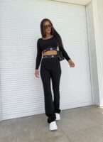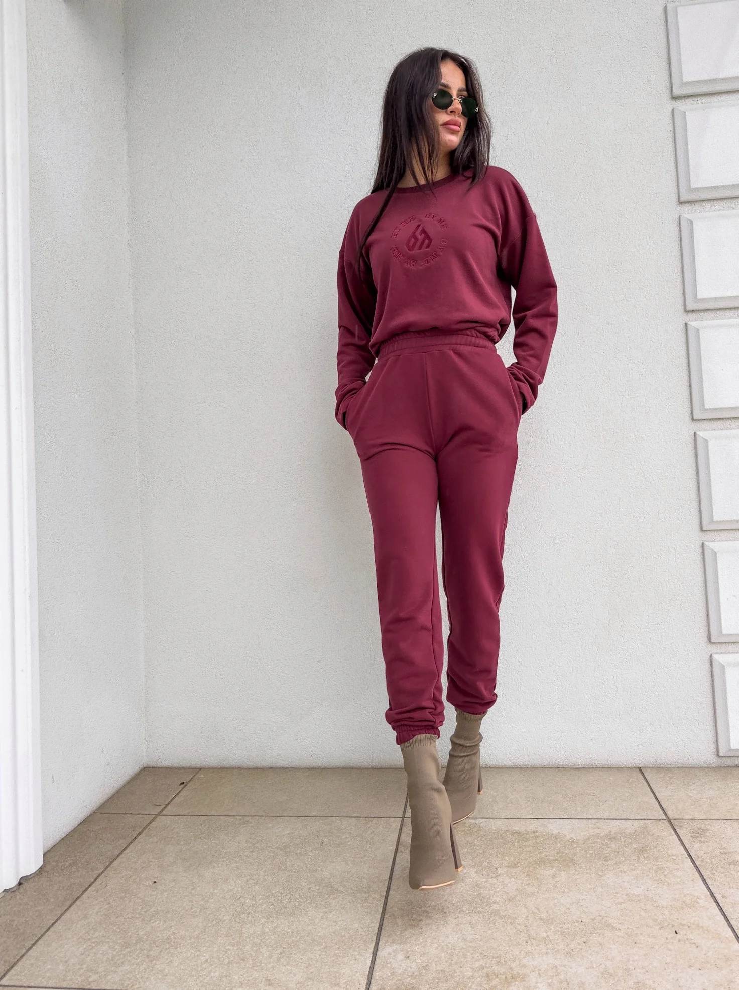 Komplet Louis składający się z bluzy o luźnym kroju, z długim rękawem z troczkiem regulującym długość oraz logowaniem na środku. Spodnie mają gumki na nogawkach i w pasie oraz dwie wbudowane kieszenie.