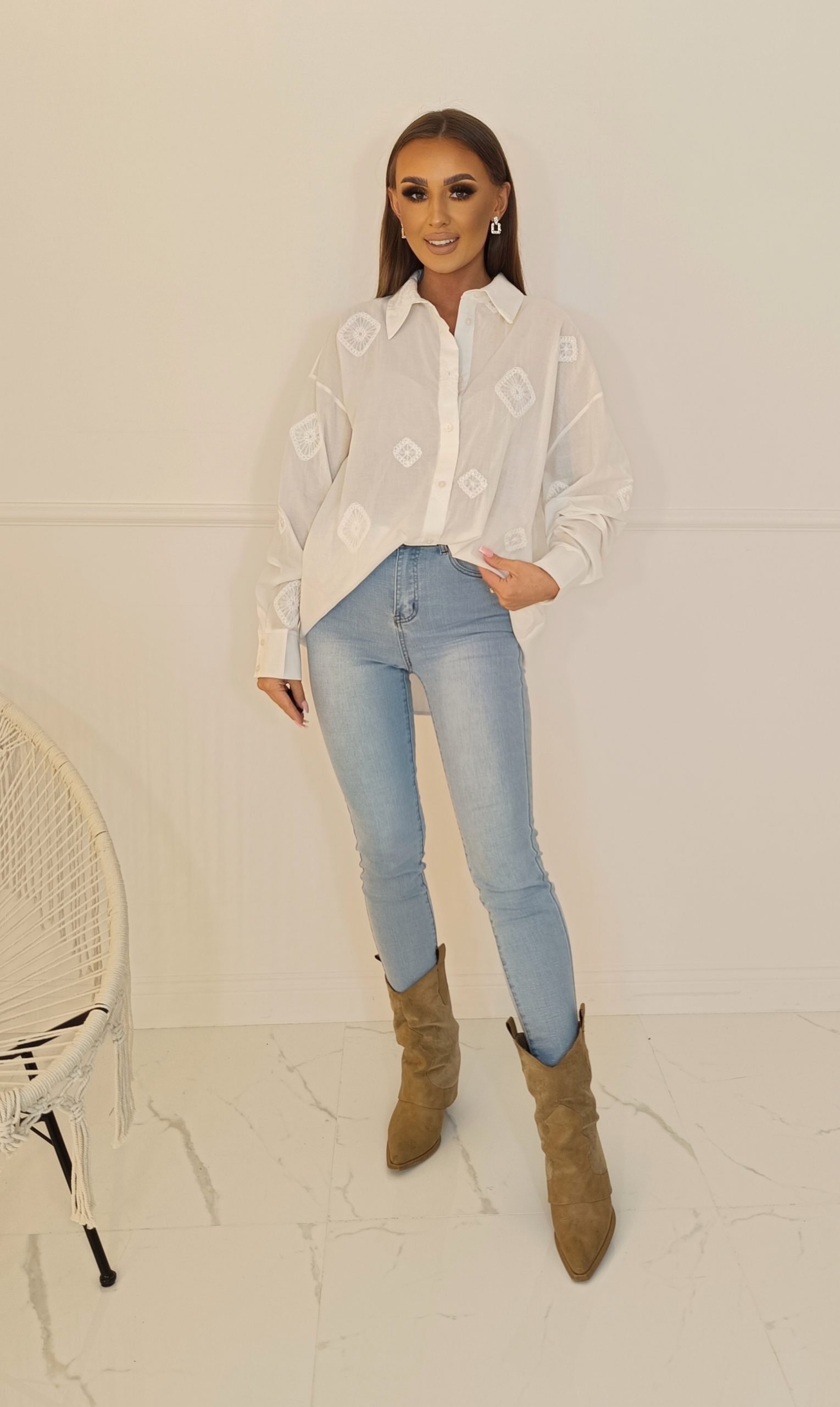 Koszula Boho Handmade charakteryzuje się luźnym krojem oraz zapięciem regulowanym na guziczki. Wykonana jest ze 100% bawełny z ręcznie haftowanymi aplikacjami.