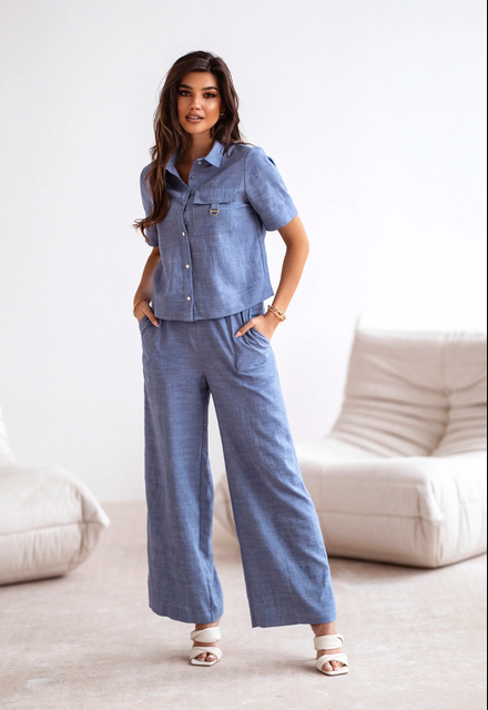 Wibs, znana z dbałości o detale i jakość, przedstawia komplet Flori & Flore, który jest kwintesencją miejskiej elegancji. Materiał imitujący jeans, będący na topie tej wiosny i lata, połączono z doskonałym składem wiskozy z lnem, zapewniając nie tylko stylowy wygląd, ale i niebywały komfort noszenia.