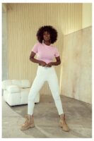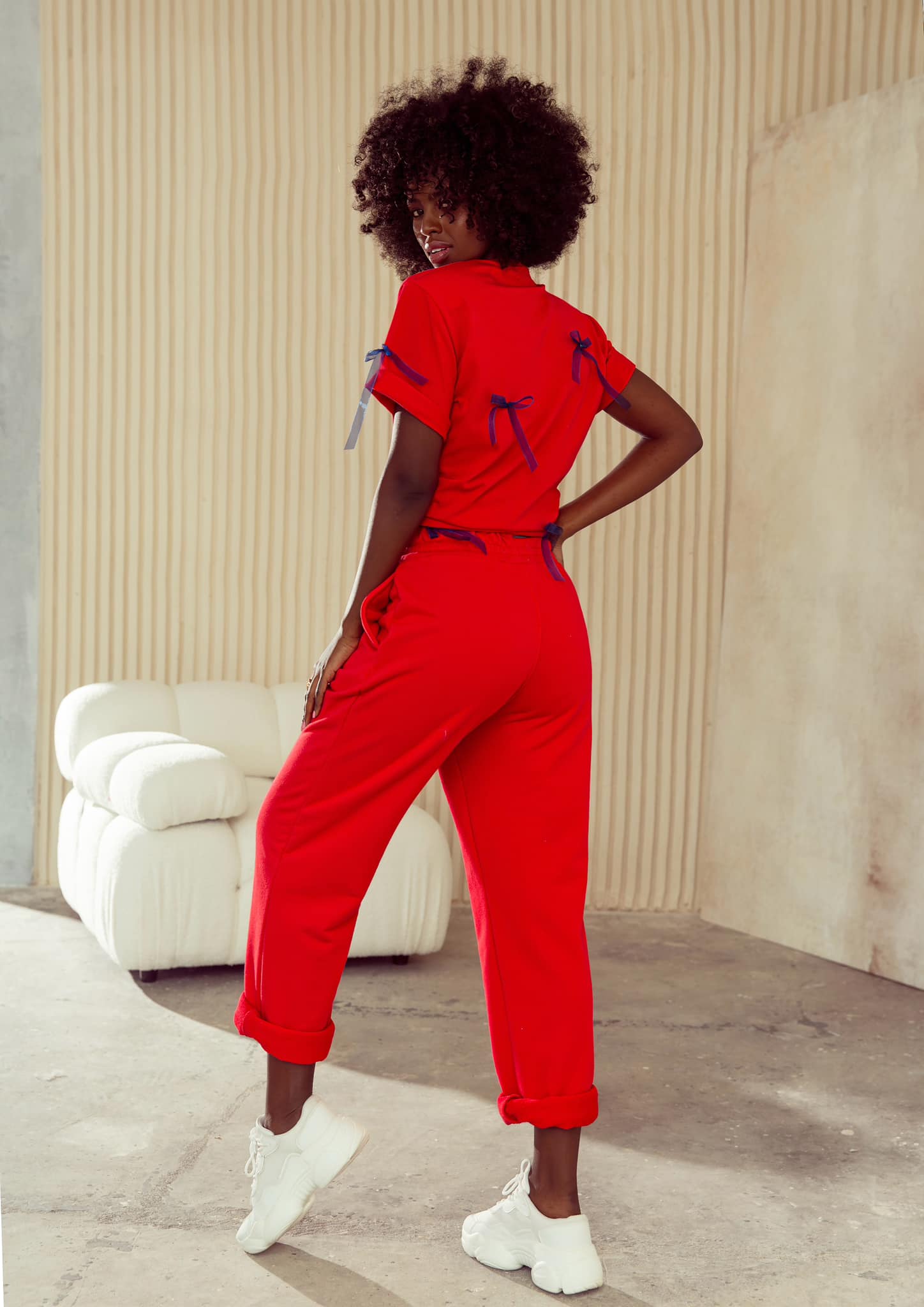 Posiada prosty krój oraz wszyte poduszki na ramionach. Ozdobiony kokardkami. Idealnie sprawdzi się w stylizacji z jeansami, szortami czy spódnicą.